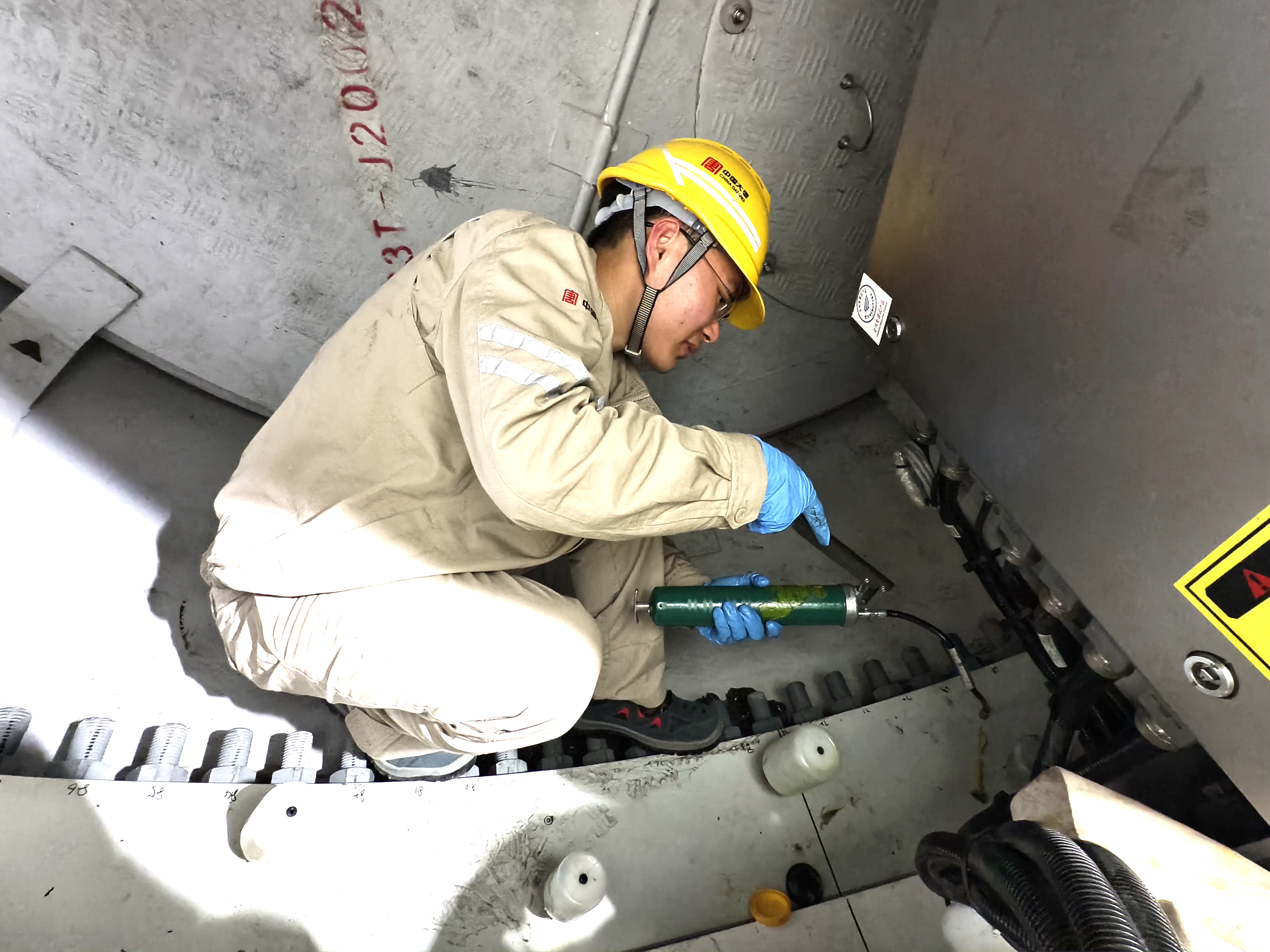 在這螺螄殼般的空間里,站直身體是奢望,彎腰弓背才是常態(tài)。每一次精準的按壓,每一次黃油的注入,看似單調(diào)重復(fù),實則暗藏玄機與風險。風機半年定檢,考驗的不僅是指尖上的“繡花功夫”,更是鋼鐵般的意志與挑戰(zhàn)極限的勇氣。