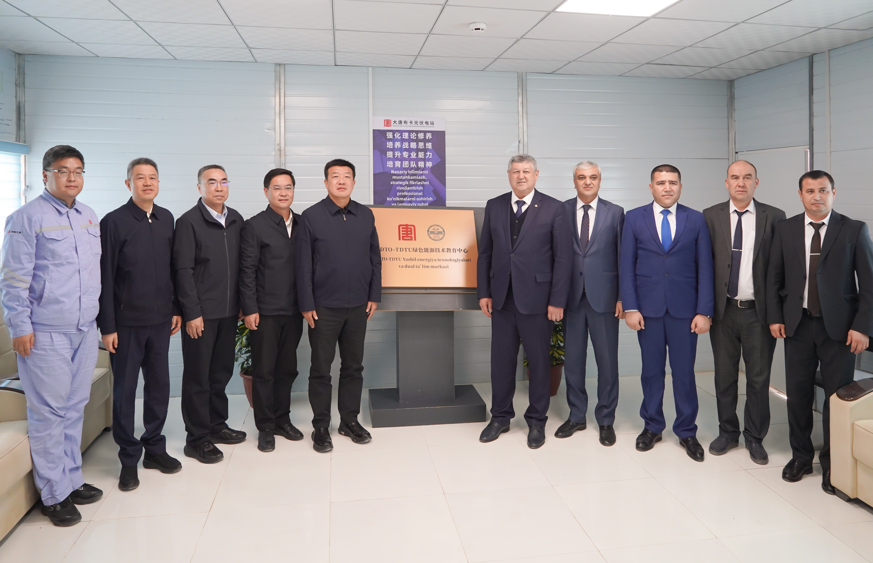 調(diào)研期間,呂軍在布卡光伏項目現(xiàn)場,與塔什干國立技術(shù)大學校長、院士薩德里丁·馬哈馬托維奇舉行會談,并共同為“大唐海投-塔什干國立技術(shù)大學綠色能源技術(shù)教育中心”揭牌。該技術(shù)教育中心后續(xù)將為塔什干國立技術(shù)大學畢業(yè)生提供實習實訓(xùn)機會,助力烏茲能源電力人才培養(yǎng)。