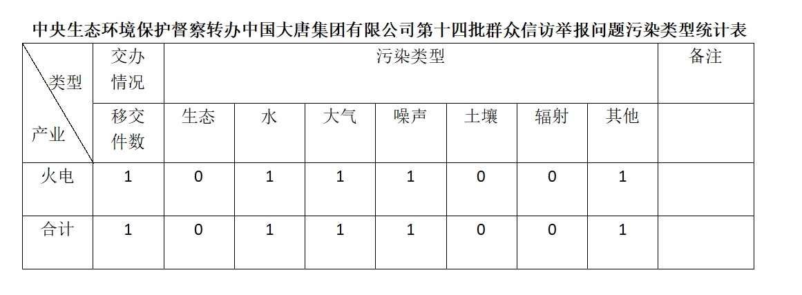 2025年6月20日,中央第七生態(tài)環(huán)境保護督察組向中國大唐集團有限公司移交第十四批群眾信訪舉報件,共計1件,為來電舉報,涉及水問題1個、大氣問題1個、噪聲問題1個、其他問題1個。所有舉報件辦理工作已第一時間進入調(diào)查核實辦理程序,辦理情況將按照相關(guān)要求反饋督察組,并及時向社會公開。