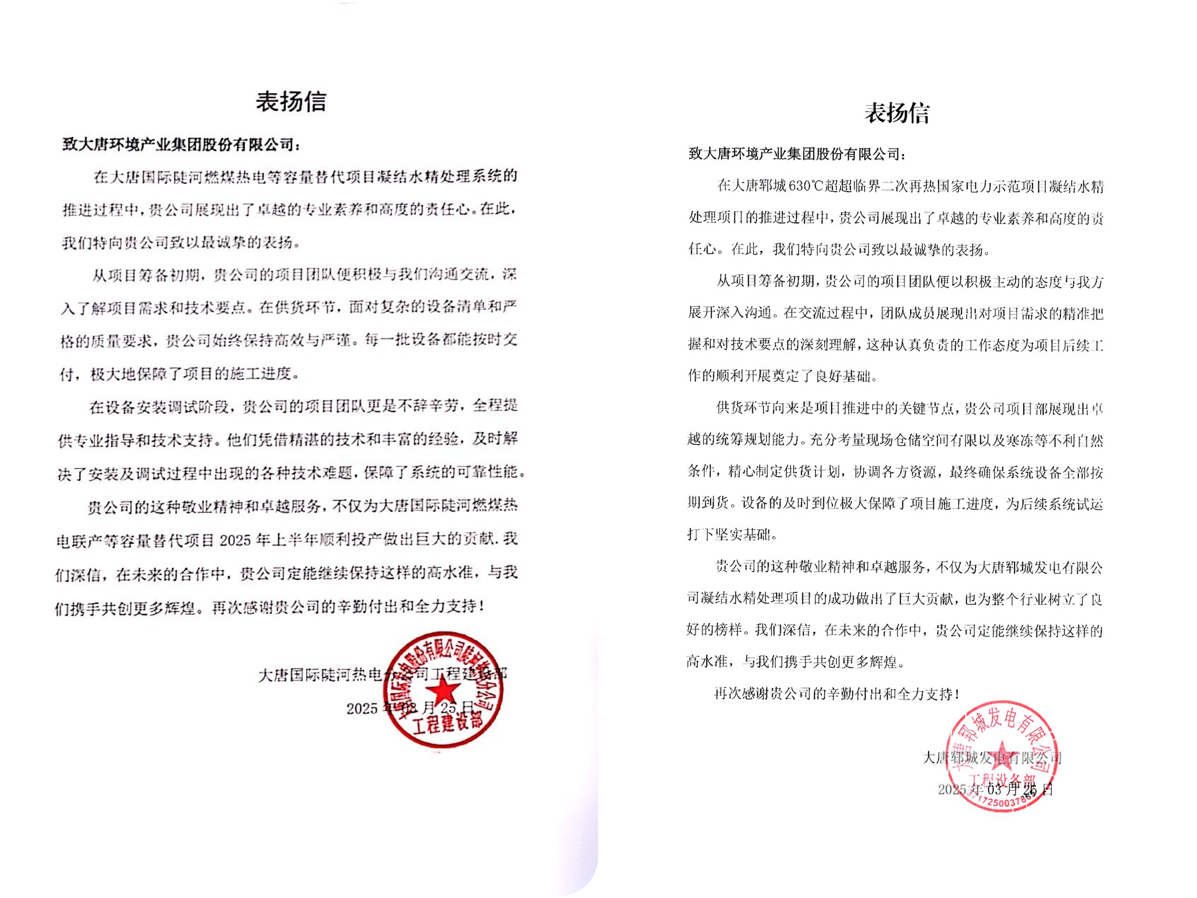 本網(wǎng)訊?近日,水處理事業(yè)部憑借在陡河項目與鄆城項目中的卓越表現(xiàn),接連收到兩封業(yè)主發(fā)來的表揚信。信中對我方團隊展現(xiàn)出的專業(yè)實力、服務精神及執(zhí)行效率給予高度評價。?