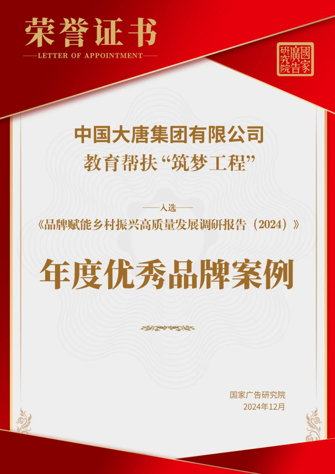 近日,由中國廣告協(xié)會指導(dǎo),國家廣告研究院與新華網(wǎng)鄉(xiāng)村振興研究院聯(lián)合主辦的《品牌賦能鄉(xiāng)村振興高質(zhì)量發(fā)展研究報(bào)告(2024)》發(fā)布暨鄉(xiāng)村振興品牌發(fā)展評價(jià)指標(biāo)體系論證會在京舉行,會上發(fā)布了2024年度優(yōu)秀品牌案例。憑借在品牌賦能鄉(xiāng)村振興工作中的突出表現(xiàn),《中國大唐教育幫扶“筑夢工程”》入選年度優(yōu)秀品牌案例。