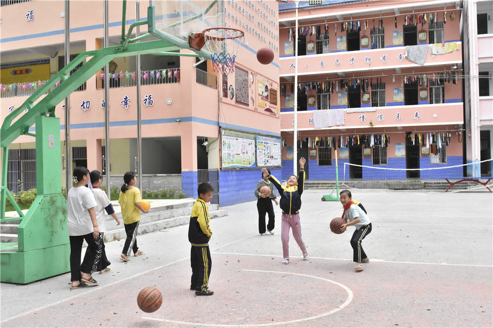??????板蘭村小學(xué)的孩子們正在球場歡快地投籃